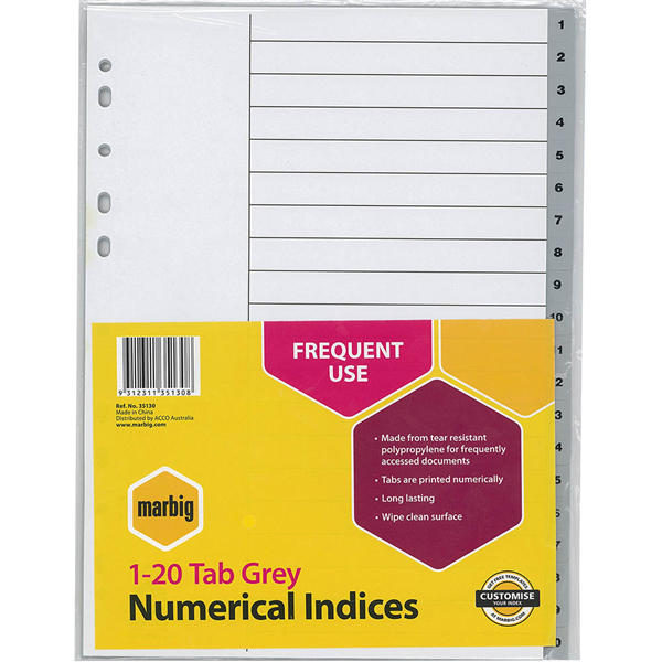 Marbig numerical indices are made of strong polypropylene which allows files to be frequently accessed and wont break or tear with constant use