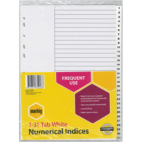 Marbig numerical indices are made of strong polypropylene which allows files to be frequently accessed and wont break or tear with constant use