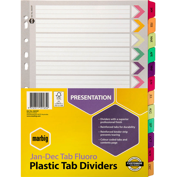 Marbig dividers are ideal for use in all binders and lever arch files. Available in a variety of tabs and colours