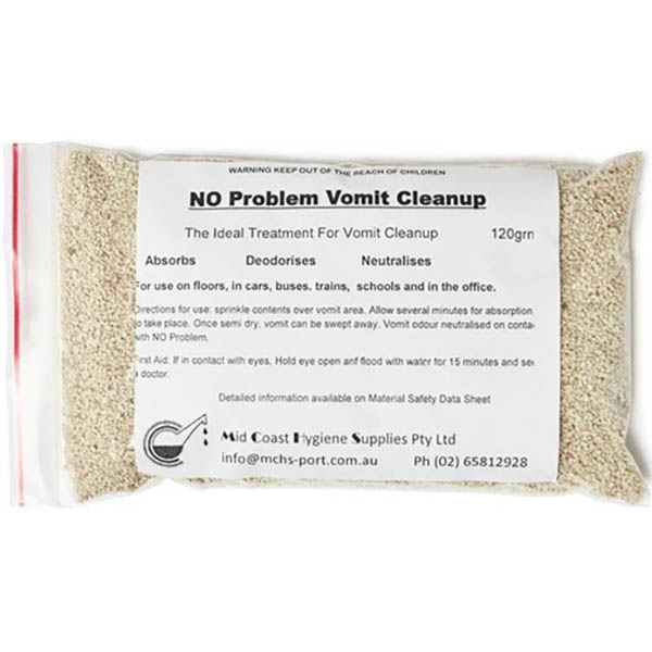 No Problem Vomit Clean Up is formulated as a simple but effective method of cleaning up those nasty vomit accidents Contains odour neutralisers and natural absorbent materials to eliminate odours and dry the moisture Safe to use around children and is completely bio degradable Can be disposed of safely in every day waste bins Ideal for use in child care centres, buses, trains, taxis and schools. In fact anywhere a messy vomit accident happens Absorb and deodorises Simple and easy to use Can be used on all types of floors