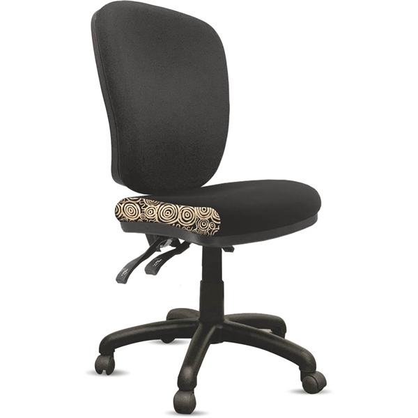 Featuring a wider seat for enhanced seating comfort, as well as an eco-friendly back for superior back comfort These AFRDI rated load chairs are perfect for education spaces, universities, or any office areas with indigenous fabric and black commerical fabric upholstered Heavy duty gas lift cylinder Moulded seat foam for supreme comfort Fire retardant contoured moulded foam A unique commercial fabrics designed by Nelly Patterson (Indigenous Artist) combined with K2 black fabric to upholster the chair