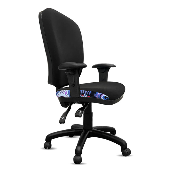 Featuring a wider seat for enhanced seating comfort, as well as an eco-friendly back for superior back comfort These AFRDI rated load chairs with arms are perfect for education spaces, universities, or any office areas with indigenous fabric and black commerical fabric upholstered Heavy duty commercial chair with 3 lever mechanism and ratchet back height adjustment Scallop arm pad on top for height adjustable arms to rest with very strong and durable button locking system Heavy duty gas lift cylinder Base: 5 way 700mm commercial grade nylon base Moulded seat foam for supreme comfort Fire retardant contoured moulded foam A unique commercial fabrics designed by Nelly Patterson (Indigenous Artist) combined with K2 black fabric to upholster the chair