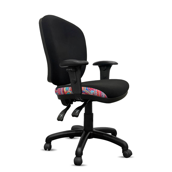 Featuring a wider seat for enhanced seating comfort, as well as an eco-friendly back for superior back comfort These AFRDI rated load chairs with arms are perfect for education spaces, universities, or any office areas with indigenous fabric and black commerical fabric upholstered Heavy duty commercial chair with 3 lever mechanism and ratchet back height adjustment Scallop arm pad on top for height adjustable arms to rest with very strong and durable button locking system 5 way 700mm commercial grade nylon base Heavy duty gas lift cylinder Moulded seat foam for supreme comfort Fire retardant contoured moulded foam A unique commercial fabrics designed by Nelly Patterson (Indigenous Artist) combined with K2 black fabric to upholster the chair