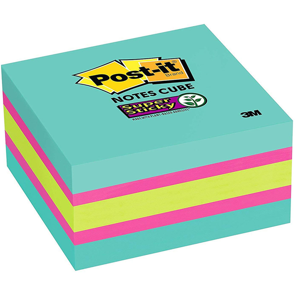 Post-it Super Sticky Notes have 2X the sticking power Leave a cube on your desk so you always have a note close by Great for reminders and short notes Post-it Super Sticky Notes are recyclable The paper in Post-it Super Sticky Notes is sourced from certified, renewable and responsibly managed forests Memo cube is made up of the following colours- Aqua Wave 90 sheet, Fireball Fuchsia 45 sheet, Neon Green 90 sheet, Fireball Fuchsia 45 sheet, Aqua Wave 90 sheet 360 notes per cube