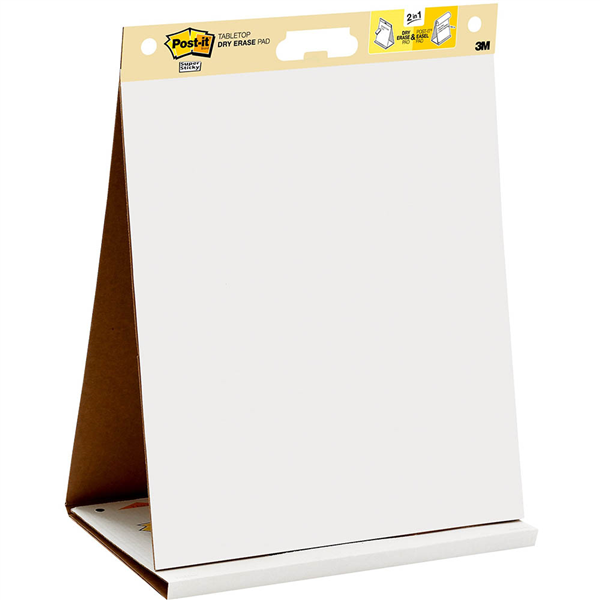 Easy to use built-in easel stand Includes a dry erase panel High quality, bleed resistant paper Folds for easy portability Adhesive paper sticks securely, removes cleanly No pins, tacks or tape needed Great for taking to on-the-go and open space meetings