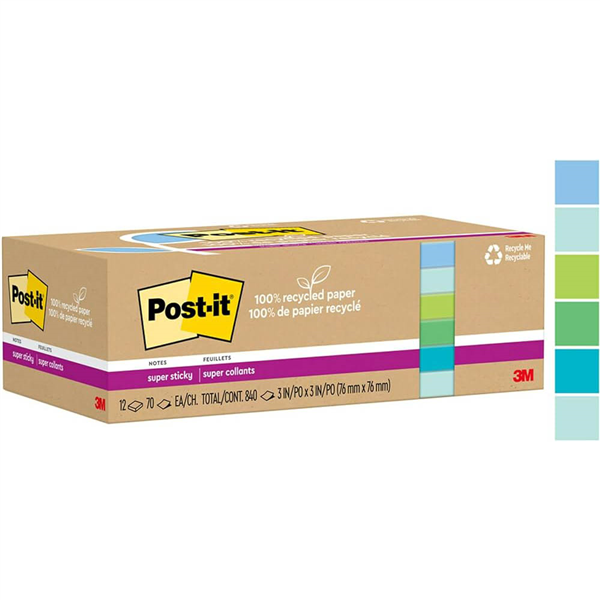 POST-IT 654R-12SST SUPER STICKY NOTES 76 X 76MM RECYCLED OASIS PACK 12