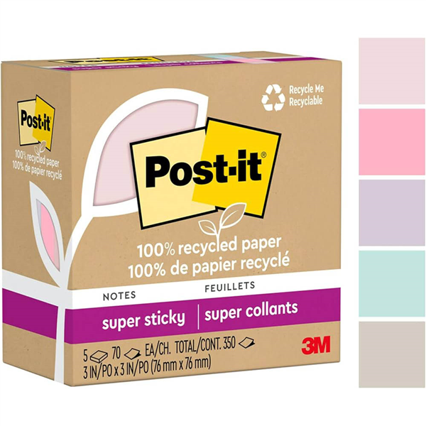 POST-IT 654R-5SSNRP SUPER STICKY NOTES 76 X 76MM RECYCLED WANDERLUST PASTELS PACK 5