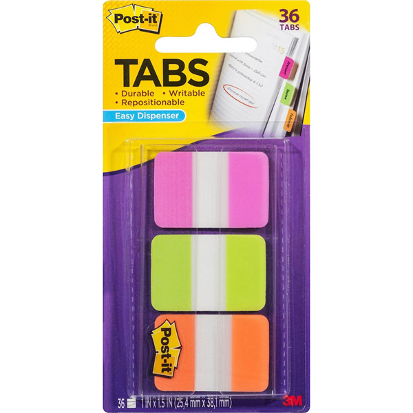 Whether you are organising the families favourite recipes, tabbing important exam information or organising work files and documents, Post-it Tabs withstand constant use Sturdy in design Post-it Tabs stick securely and remove easily when required Label and colour code quickly and easily Post-it Tabs create order Easily organise binders into sections Assorted colours give you flexibility to organise by colour Durable, Writeable, Repositionable Also great for planners, notebooks and file folders Sticks securely, removes cleanly