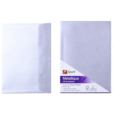 QUILL C6 METALLIQUE ENVELOPES PLAINFACE STRIP SEAL 80GSM 114 X 162MM SILVER SHADOW PACK 10