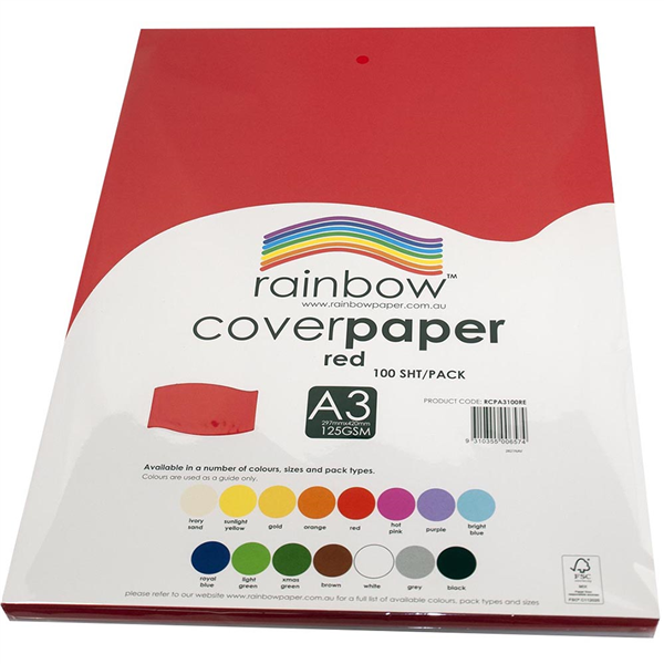 RAINBOW COVER PAPER 125GSM A3 RED PACK 100