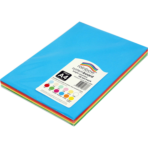 RAINBOW SYSTEM BOARD 150GSM A4 BRIGHT ASSORTED PACK 100
