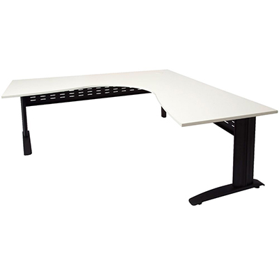 The Rapid Span Corner Desk features a 25mm melamine top with cable entries, metal legs and perforated modesty panel