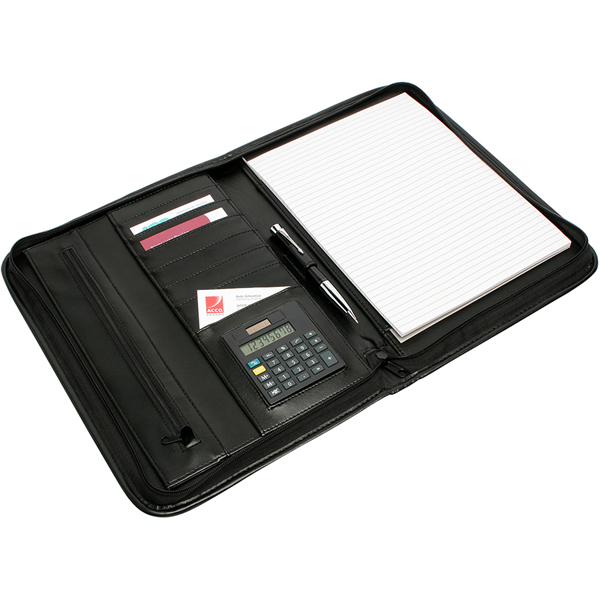 Features a top bound writing pad, expanding pockets and additional storage Includes A4 writing pad and calculator Pen loop and expanding pocket for storage Additional zippered storage and business card holders Stylish design