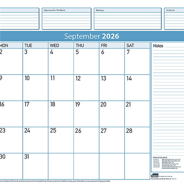Features a 12 month reference and large area for notes National public holidays listed Note down appointments, schedule events and commitments or take notes, showing a full month at a glance Suitable refill for the Sasco Deluxe Desk Planner