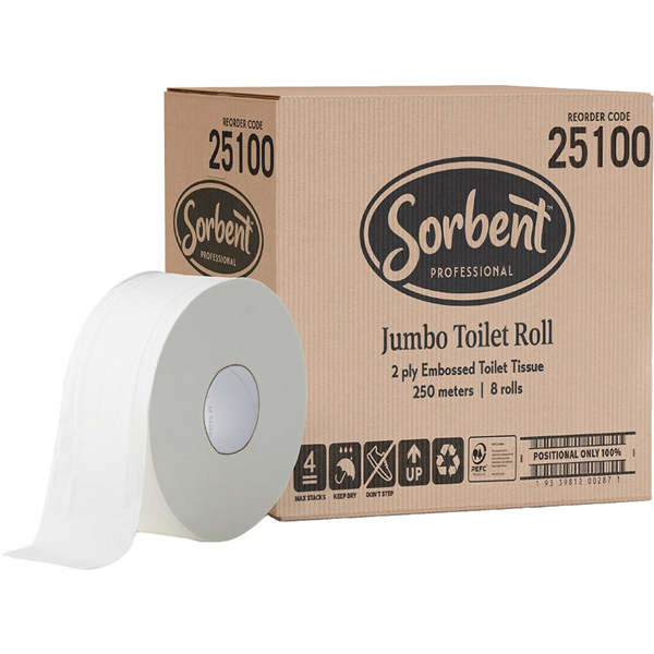 The oversized 250m jumbo roll means less chance of running out at inconvenient moments and reduced frequency of refill changeovers, saving both time and money The jumbo length toilet paper roll and bulk 8 pack makes it an economical and practical choice for high volume facilities where quality is important Embossed for extra softness Compatible with Sorbent 25504 & 25505 dispensers