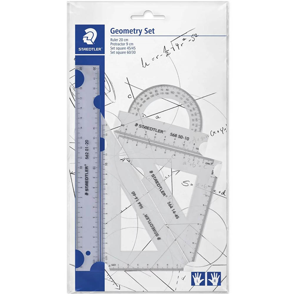 The Staedtler 569 Geometry Set includes 4 pieces to help you draw accurate circles, squares, triangles, lines and other shapes The bevelled edges prevent pens from sliding over each piece and spreading ink where you don't want it More than just a common tool in geometry class, they are also frequently used in the field of technical drawing Functional design coupled with exceptional technical finesse make the range Staedtler indispensable wherever accuracy is required Four piece geometry set Ideal for students Abrasion resistant scale Print on backside Metric scale