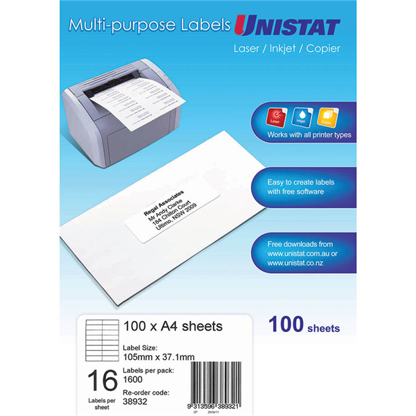Use Unistat labels in your laser printer, inkjet printer or copier Select from a full range of mailing and parcel label sizes Ideal for addressing and other applications Suitable for laser printers, inkjet printers and copiers Self-adhesive ensures labels stay secure Natural white finish