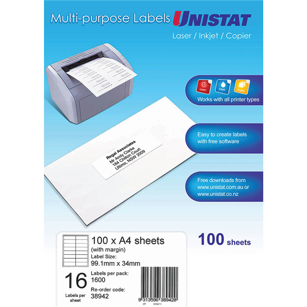 Use Unistat labels in your laser printer, inkjet printer or copier Select from a full range of mailing and parcel label sizes Ideal for addressing and other applications Suitable for laser printers, inkjet printers and copiers Self-adhesive ensures labels stay secure Natural white finish With margin