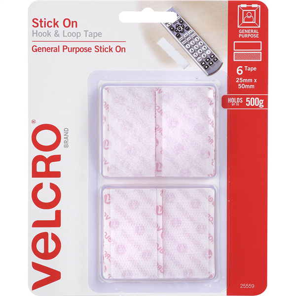VELCRO BRAND STICK-ON HOOK AND LOOP RECTANGLES 25 X 50MM WHITE PACK 6