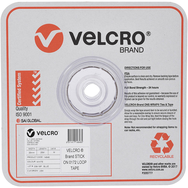 VELCRO BRAND STICK-ON LOOP TAPE 25MM X 25M WHITE