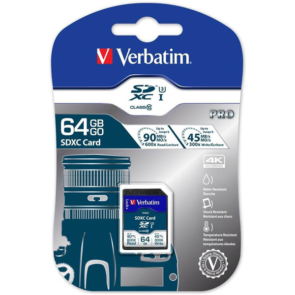 The Verbatim 64GB Pro SDHC Class 10 UHS-I (47022) memory card offers high-speed performance for capturing and transferring photos, videos, and other data