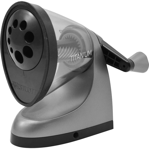 The Westcott iPoint ClassAct pencil sharpener features proprietary titanium bonded blade technology and antimicrobial protection