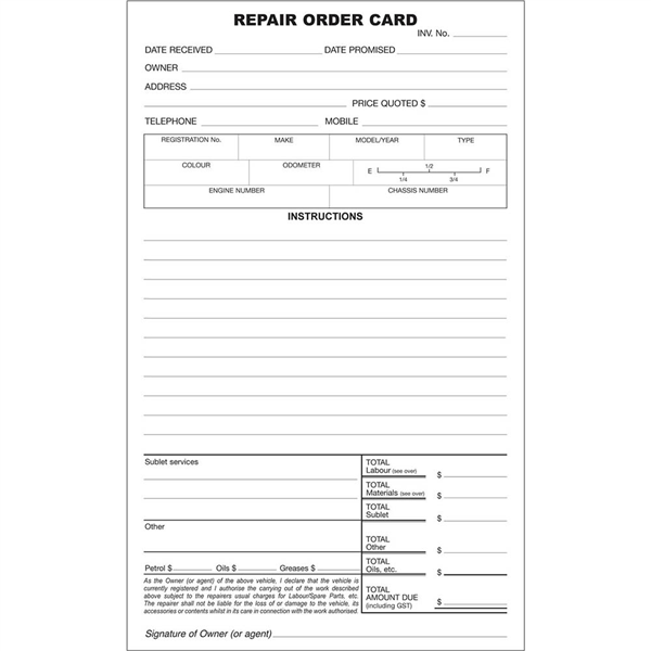 Card contains &?all care no responsibility&? clause, signature of owner and instructions for the job Zions Vehicle Record Book The reverse side is used to record the work performed and cost, parts and materials used White card, printed two sides Suitable for salespeople, delivery, company vehicles etc